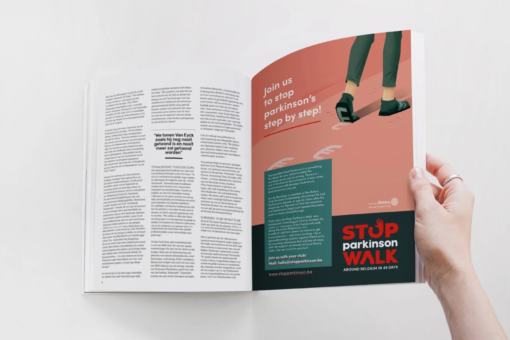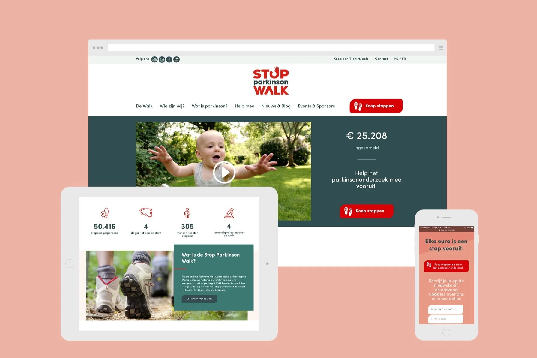 Stop Parkinson is a non-profit organisation founded by Ivo de Bisschop who was diagnosed with Parkinson's disease at the age of 62. Immediately, he felt like the disease wasn't getting enough attention nor resources for scientific research. That's why he decided to take on a big challenge with a few friends to raise awareness and funding: the Stop Parkinson Walk. We created all campaign material for the event, and a brand new website for the non-profit that saw the light of day after an extensive UX and UI trajectory.